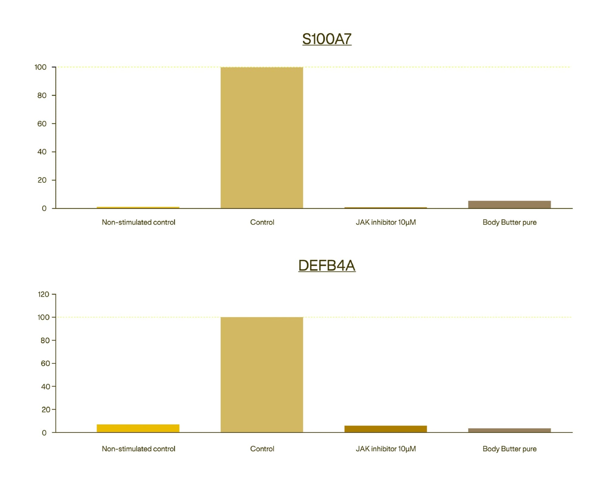 A reconstructed epidermis was stimulated with an inflammatory cytokine mix IL-4 + IL-13 + IL-22 + TNF-α to mimic the chronic phase of atopic dermatitis. The genetic material (mRNA) was analyzed to see how the Soothe Skin Butter impacted the expression of specific genes related to innate immunity, inflammation and skin barrier function after 24 hours of use.