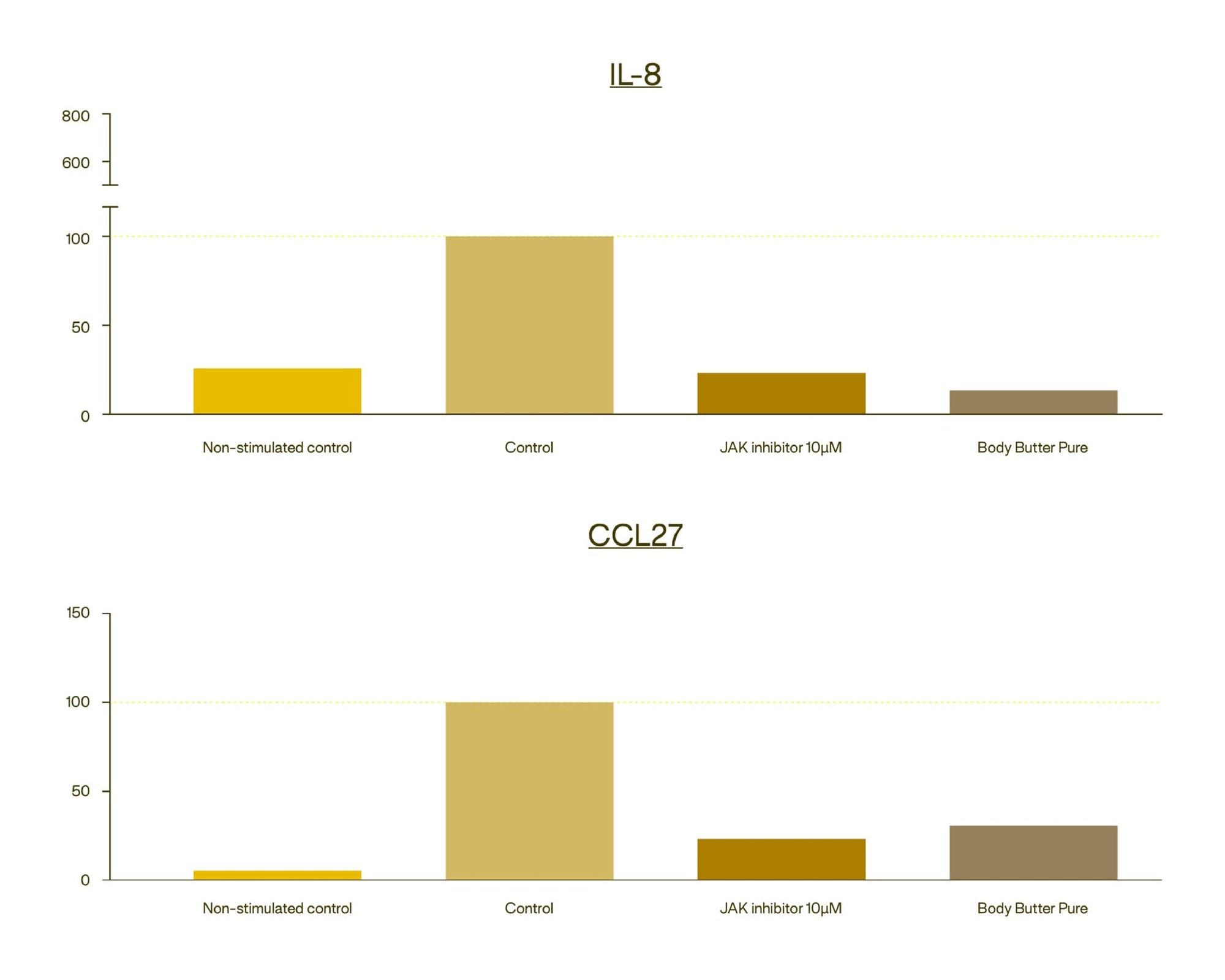 In order to ascertain the efficacy of JUANA Soothe Skin Butter at addressing atopic skin dermatitis, in vitro studies were conducted by an independent laboratory in France that specializes in cellular and molecular pharmacology.